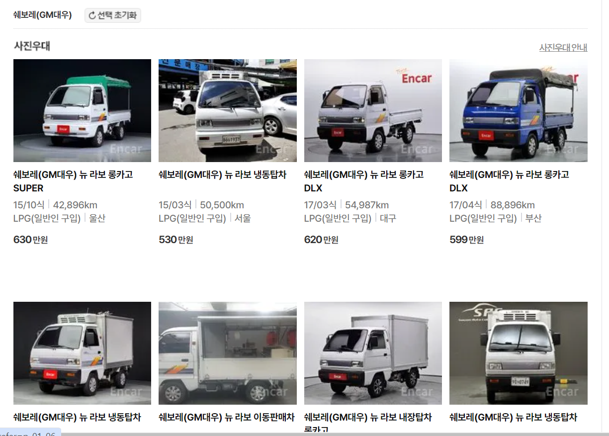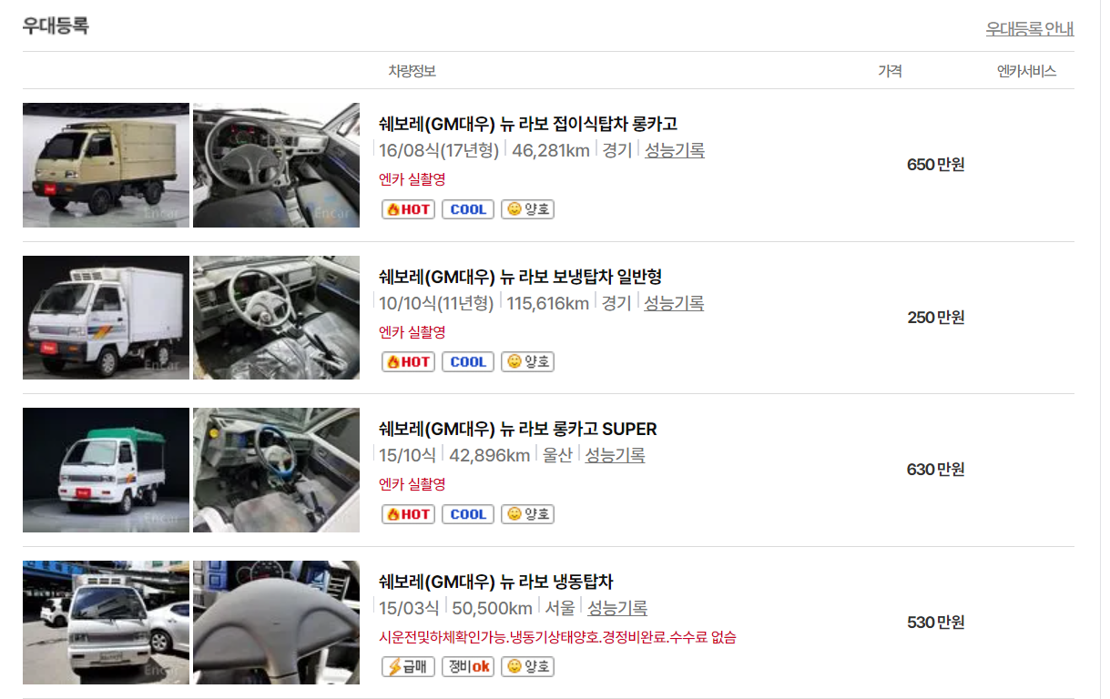 뉴 라보(2008년~2021년식) 중고차의 가격은 120만원에서 860만원 사이입니다. 이 모델은 다양한 연식과 옵션을 제공하며, 가격은 차량의 상태, 주행 거리, 그리고 추가적인 기능에 따라 달라질 수 있습니다. 아래 표는 각 연식별 뉴 라보 중고차의 가격대를 보여줍니다.