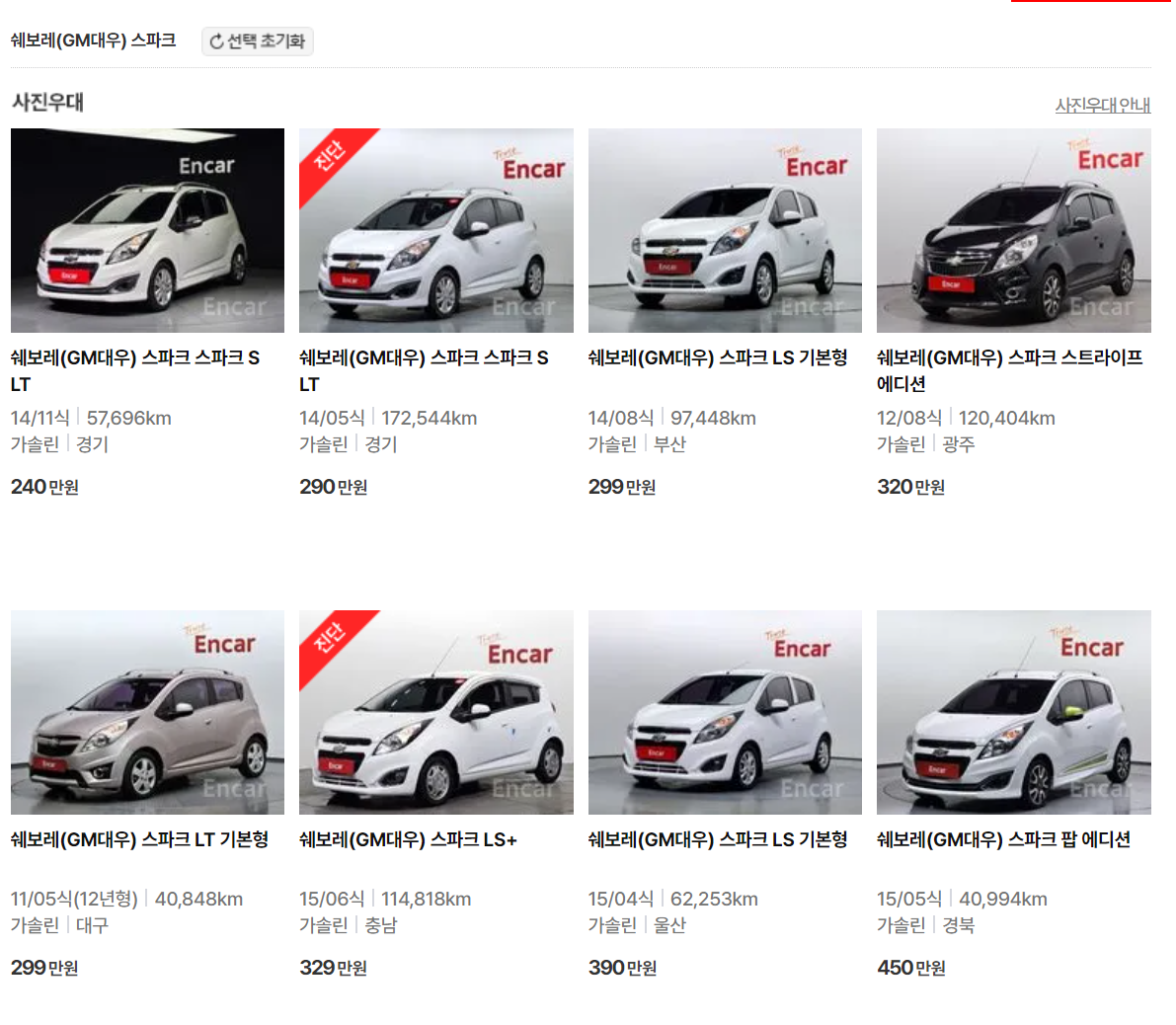 1. 3세대 스파크(2011~2015년식)는 옵션 종류가 많고, 옵션별로 차량 가격 차이가 크게 납니다.